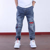 Upgrade your child's wardrobe with these stylish yet comfortable jeans. Made with an elastic waistband and available in a range of sizes, they offer the perfect fit for any growing boy. Suitable for spring and autumn, these jeans are perfect for active children ages 4 to 12+ years. With a medium wash and letter pattern design, these jeans will elevate any outfit. Upgrade your child's wardrobe today with these high-quality jeans designed for teens.